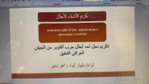وفي ختام الحفل ذكر اسم البطل العراقي الذي شارك في انتصارات اكتوبر ملازم طيار ليث زاهر منير وقد حصل على نوط الشجاعة العسكرية من الطبقة الاولى من العرب العراقي رقم (66) واليوم في احتفالات النصر الـ 52 تم تكريم الاشقاء الابطال تكريم نجل ابطال حرب اكتوبر من الجيش العراقي الشقيق لواء طيار / ليث زاهر منير البطل العراقي ….وتم اخذ صور تذكرية مع الملحقات العسكرية للدول المعتمدة في بغداد ثم وجبة عشاء على شرف النصر العظيم الذي حققه الجيش المصري في 6 اكتوبر 1973……انتهى